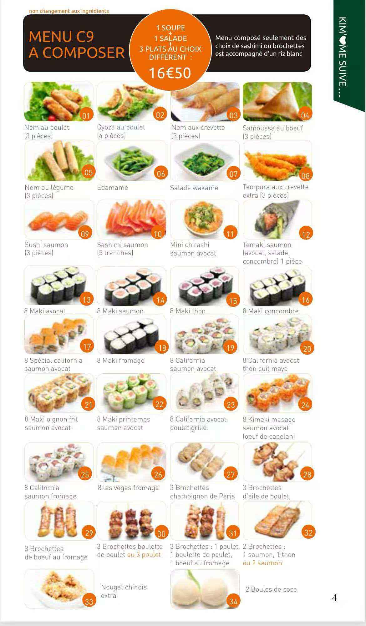 Soupe, Salade, Riz; 8 Maki saumon,2 Pièces de sushi,4 Pièces de sashimi ou 100%saumon;4 Brochettes(1Boulette de poulet,1Aile de poulet,1Poulet,1Fromage)